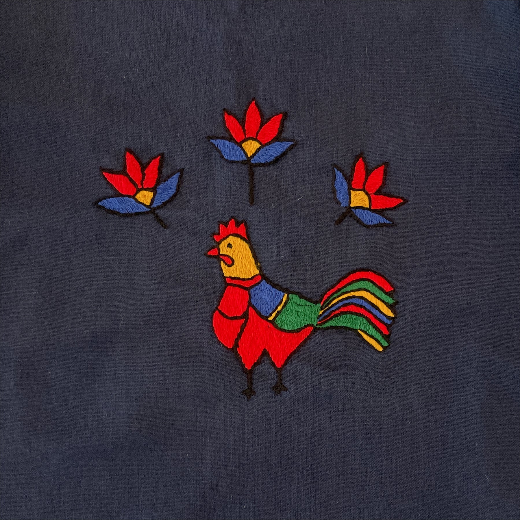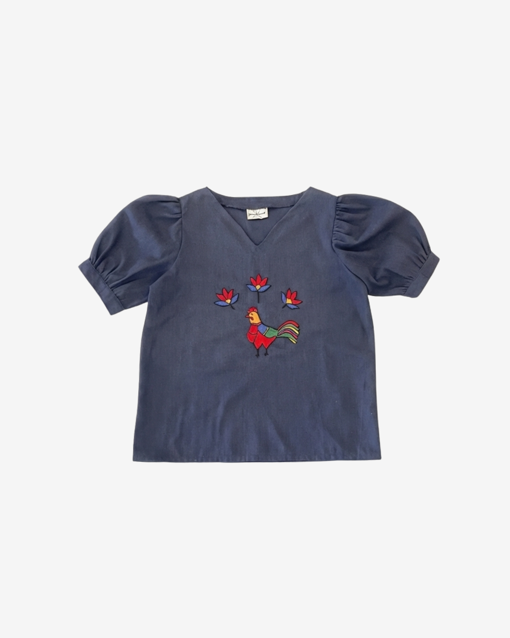 A celebration of morning light and handcrafted soul. TheKhoros top features a vibrant hand-stitched rooster motif on premium navy cotton, designed with statement puff sleeves for a modern, whimsical silhouette. Poetic, airy, and intentional.
