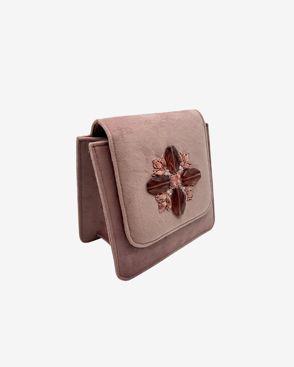 A whisper of velvet and a spark of heritage. TheNaz clutch is a structural masterpiece in dusty blush velvet, featuring a central hand-detailed "tile" motif of glass stones and metallic embroidery. Elegant, soulful, and timeless.