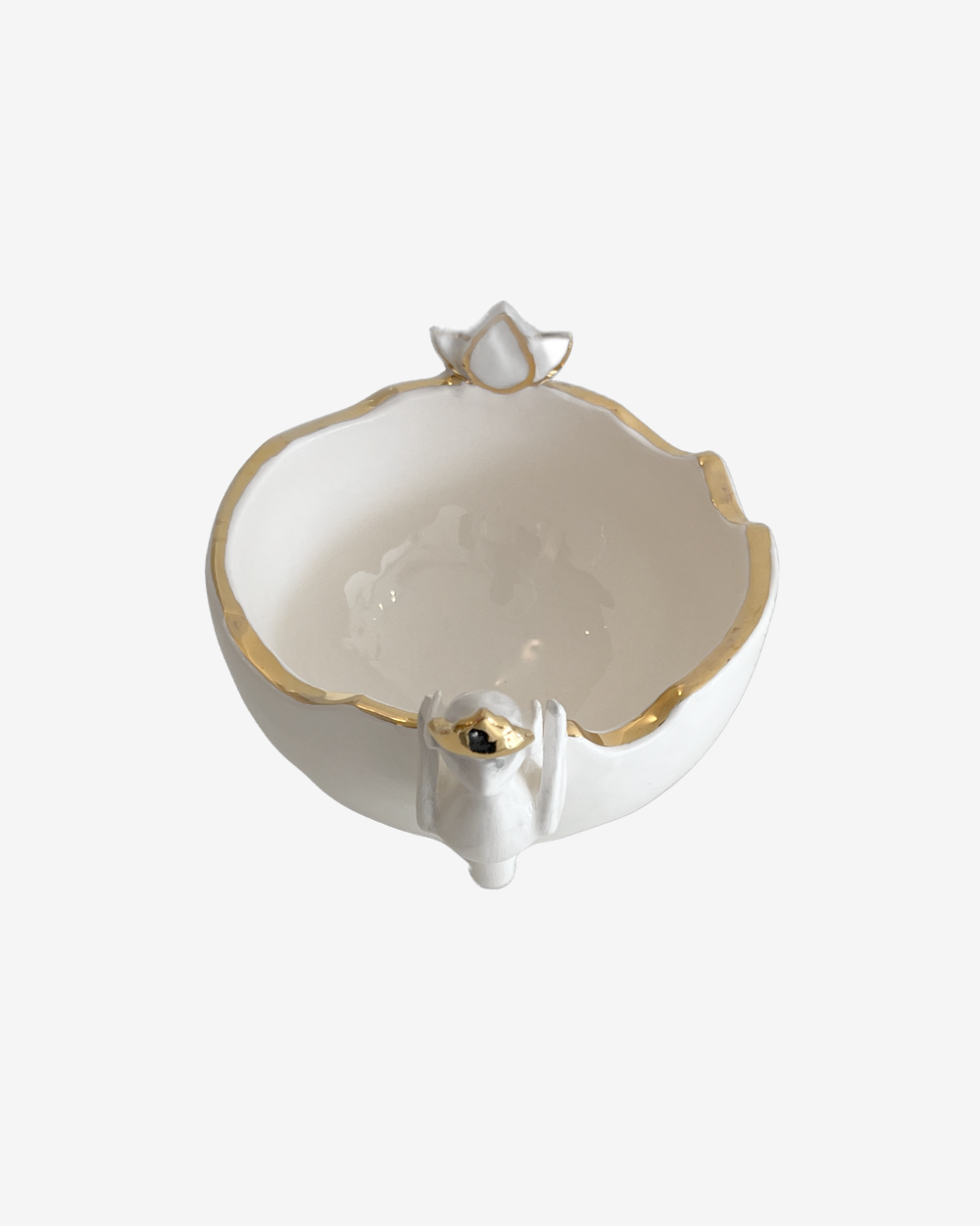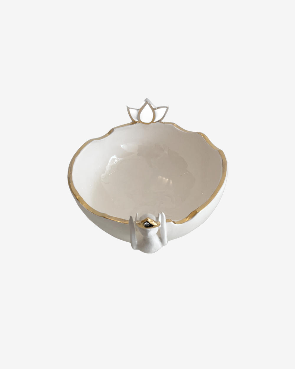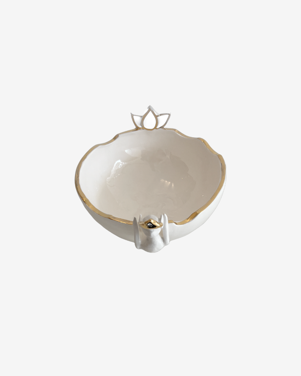 A vessel of celestial grace. TheHoma bowl features a sculptural silhouette with hand-molded symbolic accents and a radiant golden rim. Available in three nested sizes, it brings a touch of royal heritage and handcrafted soul to your intentional table.